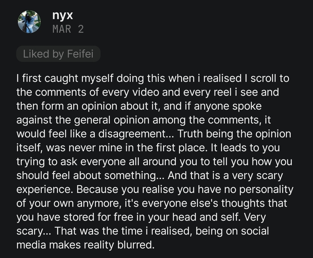 Slap after slap after slap. Good lord. Brilliant brilliant articles. I've recently begun arguing. While consuming anything off the internet, I try to find loopholes and to form an out of the world opinion about the topic. For me, forming an authentic opinion was equals to going against whatever people try to feed me and coming up with a new notion which reflects the glories of my still-learning brain. In my defense, it makes sense. Atleast to me. Taking this article for example. Following this brilliant advice would be conforming to the writer's views again, no? No. And thank God, I learnt it. That arguing w an opinion and losing against it to accept it is forming an original opinion too. Taking inspiration from others opinions and meditating about it long enough to know whether you have ACTUALLY taken a deep-dive into the topic, WHY you agree to it and HOW you will defend it, is fine and something you should be proud of in this generation.